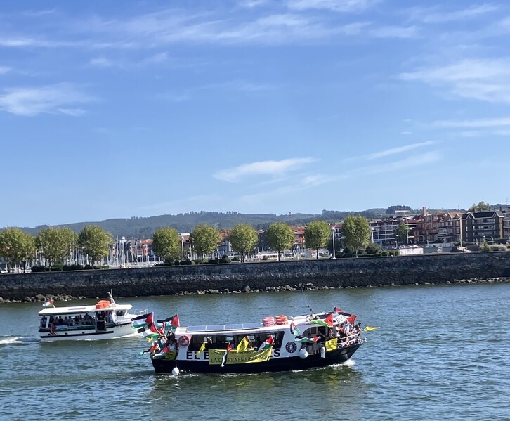 Antolatzaileen asmoa bete da, eta nola gainera: itsasadarrean, ‘flota’ koloretsu eta zaratatsua, eta haren ertzetan, banderak eta Palestinaren aldeko aldarrikapenak zabaltzen dituzten herritarrak. Banderolak, eskuz eginiko karteltxoak, Palestinako banderak, kolore guztietako kufiyak (palestinar zapiak)... haurrak, gazteak, adindunak... belaunaldi asko batu dira protestara.