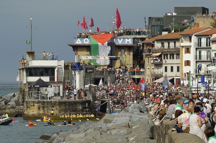 Donostiako kaian, berriz, ohiko koloreez gain, Palestinarekin elkartasunak leku berezia eskuratu du. Arraunlariak zapi palestinoa lepoan direla ibili dira, Donostia Palestina elkartearen ekimena jarraituz. Jaiarekin batera, aldarrikapenarentzat ere leku berezia eginez.