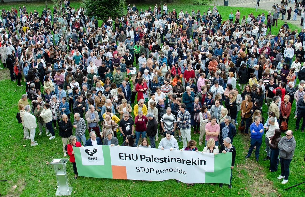 Representantes de la comunidad de Euskal Herriko Unibertsitatea (EHU) se han concentrado este lunes en los campus de Araba, Bizkaia y Gipuzkoa para rechazar el «insoportable sufrimiento» infligido al pueblo palestino y denunciar «enérgicamente, el apartheid que el Gobierno y el ejército de Israel están practicando en Gaza y Cisjordania». Además, han pedido «respeto y aplicación del derecho internacional humanitario» en la Franja para que, «de una vez por todas, entre la ayuda humanitaria».