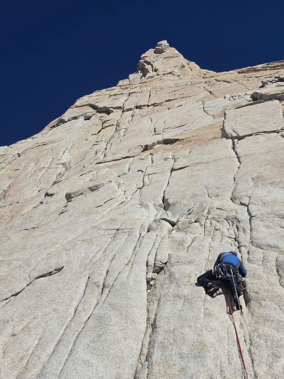 «Teok dio aurretik ditugun luzeak partekatuko ditugula. Nire sokakideak harkaitzean zeuden zailenak egingo zituen; nik, berriz, amaierako mistokoak, baita puskatuta zegoen tarte bat ere. Luze gehienak ondo igo genituen, baina horietako bik buruhauste batzuk eragin zizkiguten. Hotzaren ondorioz, artesiak izotzarekin estalita zeuden. Egoera horrek artifizialean eskalatzera behartu gintuen. Zorrotza izan zenez, denbora gehiago eskatu zigun.
