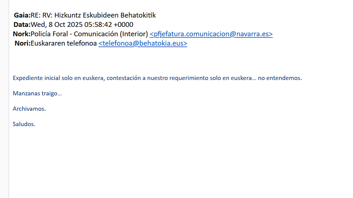 «Expediente inicial solo en euskera, contestación a nuestro requerimiento solo en euskera... no entendemos. Manzanas traigo... Archivamos» izan zen Foruzaingoaren bigarren erantzuna.