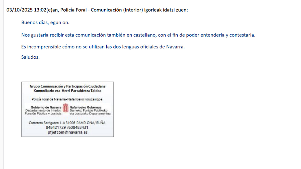 Horretarako, Foruzaingoaren komunikazio taldera jo zuen Behatokiak erantzun hau jasoz email korporatibotik: «Nos gustaría recibir esta comunicación también en castellano, con el fin de poder entenderla y contestarla. Es incomprensible cómo no se utilizan las dos lenguas oficiales de Navarra».