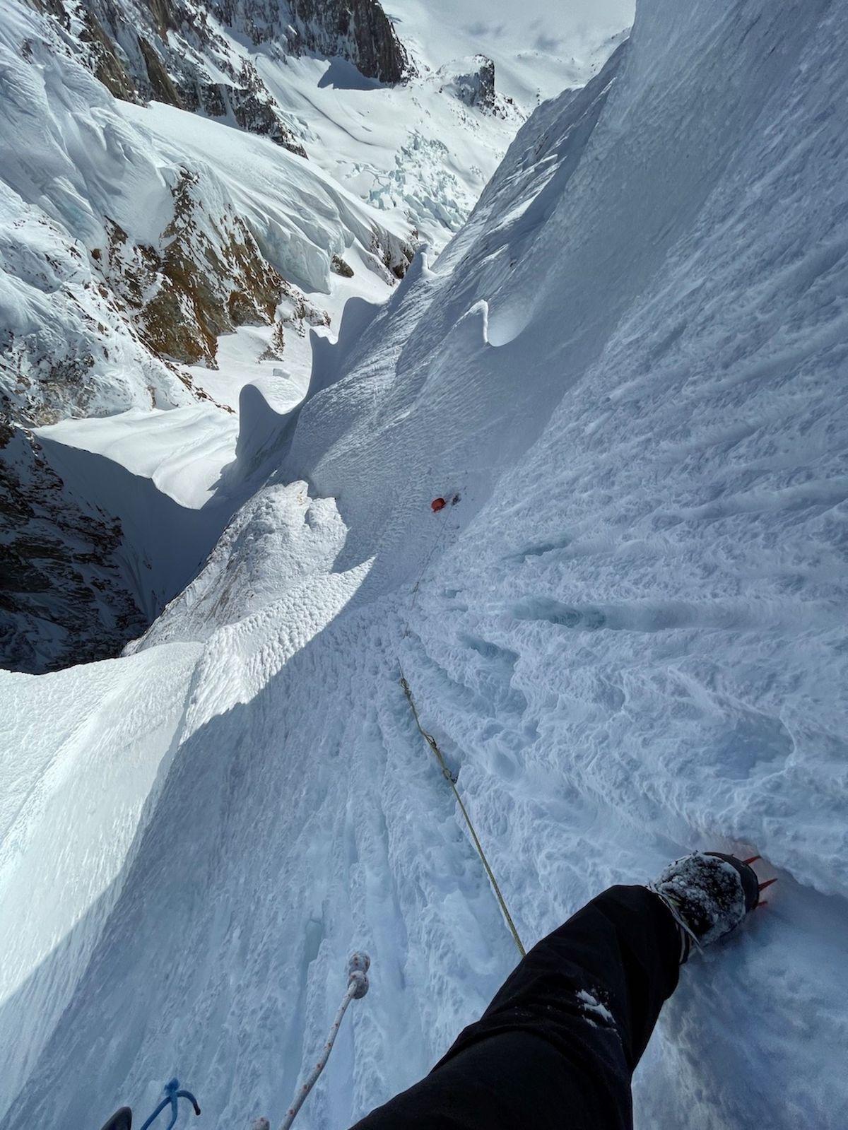 Azpimarratzeko da protagonistak honek bere lehen eskalada egunean egin zuena; izan ere, 'Ragni'-ren ia luze guztiak patrikan zituen. Soilik azken hirurak falta zitzaizkion. Alabaina, metro horiek eskaladaren giltza ziren. Biharamunean, prest zegoen jardun historiko horri amaiera emateko. Lehen luzea samurra zen, baina bigarrenean lan eskerga egin behar izan zuen: «Antzigarrean ibilbidea zabaltzeko asko garbitu edo zulatu behar izan nuen, eta horrek denbora asko eskatu zidan. Pioletak ondo kokatzea eta babesteko tresneriarentzat leku egokiak aurkitzea oso zaila izan zen. Gainera, mendiaren hego-mendebaldeko isurian azken hilabeteotan serac asko erori dira. Horren ondorioz, azken zatiaren eskuinaldean ez nuen ohiko azukre moduko elurra aurkitu, baizik eta izotz urdina eta arriskutsua. Ez nuen arazorik izan sekzio horretan. Bai, ordea, haizeak eragiten dituen azken tunelak aurkitzeko. Tunel horren ordez, artesi batekin topo egin nuen. Gainera, oso txikia eta estua zen. Gorabehera horiek denbora asko kendu zidaten, eta iluntzeko hamabost minutu geratzen zirenean artesira iritsi nintzen».