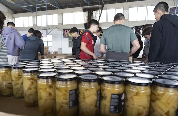 Batxilergoko ikasleak hasi dira auzolanaren lehenengo txandarekin, kiroldegiaren erdian kokatuta zeuden paleen gainean. Kate moduan elkarlanean aritu dira, paleetatik elikagaiak ateratzen, saski beltzak zenbait elikagai ezberdinekin betetzeko: zainzuriekin, ardo botilekin, hestekiekin, piperrekin… Goiza azkar igaro zaie gazteei, Errigorako kideek bertan instalatu dituzten bozgorailuetatik ateratzen zen musika lagun zutela.