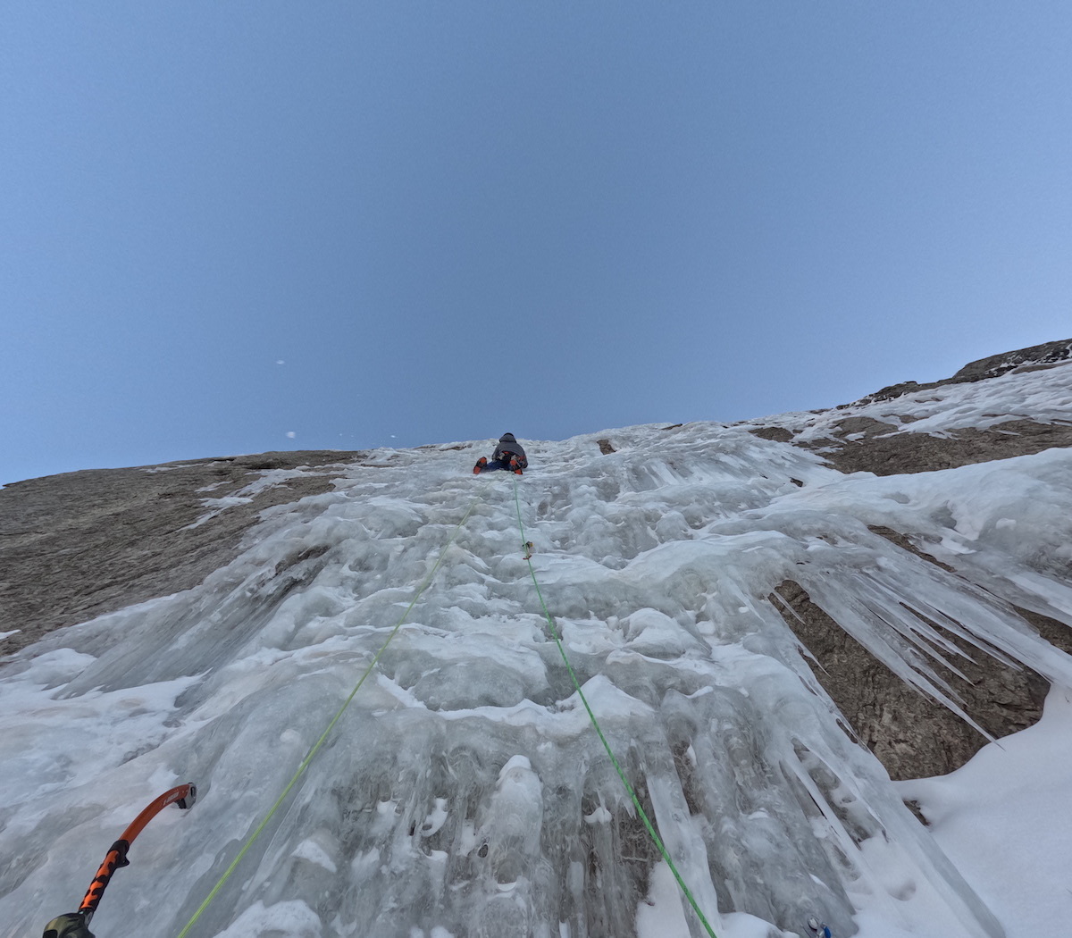 Harkaitza atzean utzi, katu-oinak kendu, kranpoiak jarri eta izotzera egin zuten trantsizioa. Bilgunera iritsi eta izotzaren baldintzak aztertu zituzten: «Placage horiek lodiagoak ikusten ziren. Eta onartu behar dut eroso sentitu ginela eskalatzen. Berez, lehen igotzaileek 5+ maila jarri zieten, baina guk eskalatutako baldintzekin 5 maila izango zuten. Oro har, oso gustura gaude eginiko lanarekin. Bidea zabaldu zutenean aura berezia zuen; zioten Pirinioetako gogorrena zela. Nire kasuan esan behar dut une bitxia bizi izan nuela. Izan ere, hirugarren murru horretara bost aldiz joan naiz eta azken bisita horretan lortu dut igotzea. Nondik eta 'Memento Mori'-tik! Gainera, guk dakigunez, oso errepikapen gutxi ditu. Amaitzeko, esan behar dizut niretzat ezustea izan dela. 'Piztu da piztia' bidea egiteko asko eskalatu nuen, baina 'Memento Mori' egiteko ez nintzen espresuki prestatu. Bi urte neramatzan pioletak hartu gabe. Gainera, bi igoeren artean soilik hilabete igaro da. Oso pozik nago bi diziplina hain ezberdinetan ondo ibili naizelako. Ez da batere erraza moldakortasun horri eustea, baina saiatzen naiz».