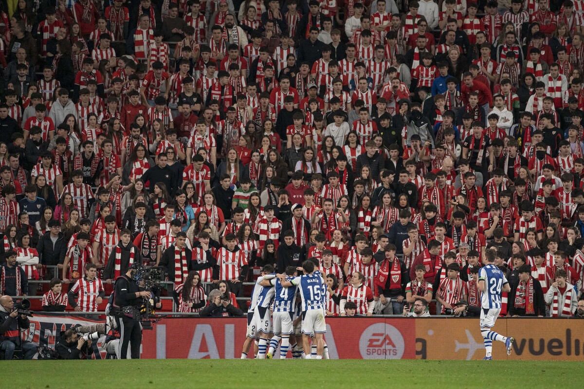 Al ritmo de la txalaparta y trikitixa sonaban los primeros acordes mientras La Catedral se vestía de gala a pesar de caer eliminados de La Liga de Campeones en el último minuto el miércoles. Al mismo tiempo, los fieles seguidores guipuzcoanos, por mucho que la hora no acompañase, no fallaron a la cita anual en San Mamés y llenaron la grada visitante de los colores azul y blanco.