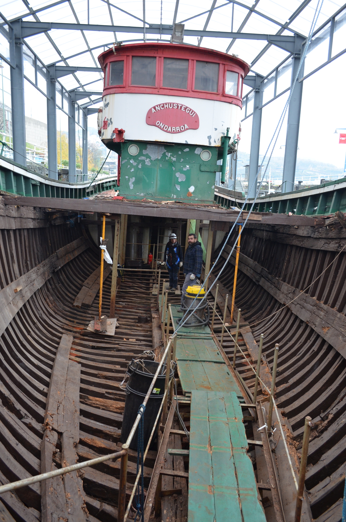 Bilboko itsasadarrean errotutako museoan gaude, Manu de la Sota kaian, eta 'gaztetuta' dirudien Ondarroako 'Nuevo Anchústegi' ontzia dugu aurrean. Antxustegitarren ordezkaritza zabala dago, zaharberritze lanetan parte hartu duten 70 bat boluntarioetako eta talde teknikoko kide ugari gerturatu dira bertara. Eta hemen dago Apraiz ere.