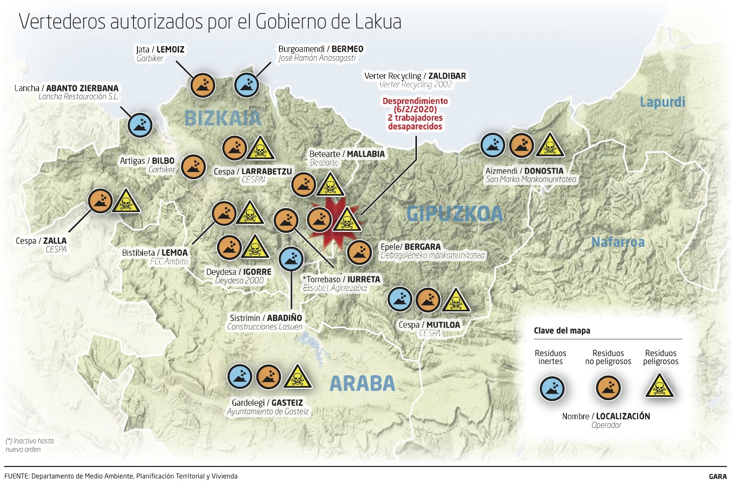Del listado de vertederos autorizados sorprende, en primer lugar, su distribución geográfica, dado que, de 16 escombreras autorizadas en la CAV, en Araba solo hay una –la problemática Gardelegi, del Ayuntamiento de Gasteiz– y en Gipuzkoa, tres; las otras 12 se encuentran en territorio vizcaíno. Dicho de otro modo, el 75% de los residuos acumulados durante 2018 en vertederos de la CAV tuvieron como destino instalaciones ubicadas en Bizkaia.