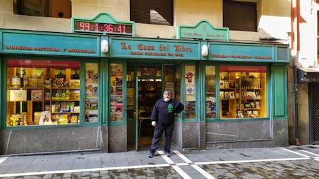 La Casa del Libro es una de ellas, quizás la más conocida de Alde Zaharra. El letrero luminoso colocado sobre su puerta señala el tiempo que falta para el txupinazo: 99 días, 1 hora, 36 minutos y 41 segundos. A su propietario, Carmelo Buttini Etxarte, se le va a hacer eterno, sobre todo porque este año no se sabe cuándo sonará ese txupinazo. Carmelo ha salido a la calle a quitarse la mascarilla y respirar un poco de aire puro, porque nunca ha estado tan puro como ahora. Sus carcajadas y buen humor transmiten confianza en que los sanfermines comenzarán cuando lo marque su famoso reloj. «Ya falta menos», tal como dice el nombre de un bar adornado con la figura de Hemingway.