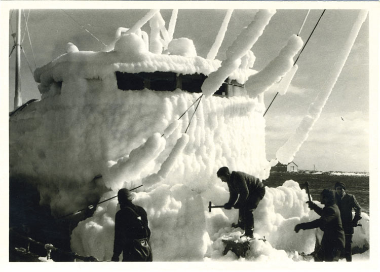 Arrantzale galiziarrak Saint Pierreko portuan, itsasontzian pilatutako izotza kentzeko lanetan.
