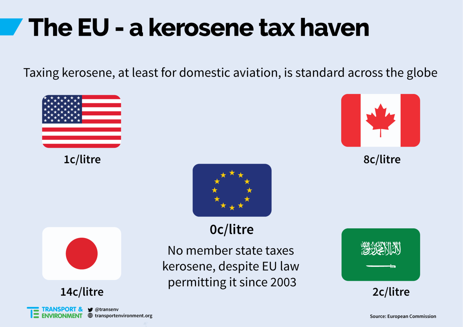 Mientras, en la UE ningún Estado miembro grava el queroseno a pesar de que la legislación comunitaria lo permite desde 2013.