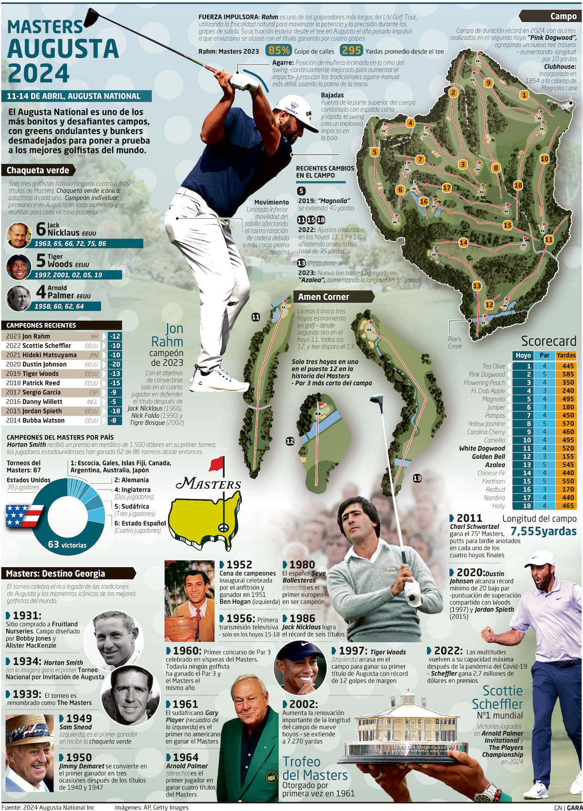 La única forma de retener la icónica chaqueta verde de campeón es firmar un doblete en Augusta. Rahm tiene clara la magnitud del desafío y el nivel de sus rivales, que van de Scottie Scheffler –ganador en 2022– y el norirlandés Rory McIlroy –que pelea por completar el grand slam en su carrera–, a Brooks Koepka, Jordan Spieth y el japonés Ideki Matsuyama. Tampoco se podría descartar a Tiger Woods que, a sus 48 años, regresa a este campo por 29º año tras estrenarse en 1995 y ganar cinco títulos desde entonces.