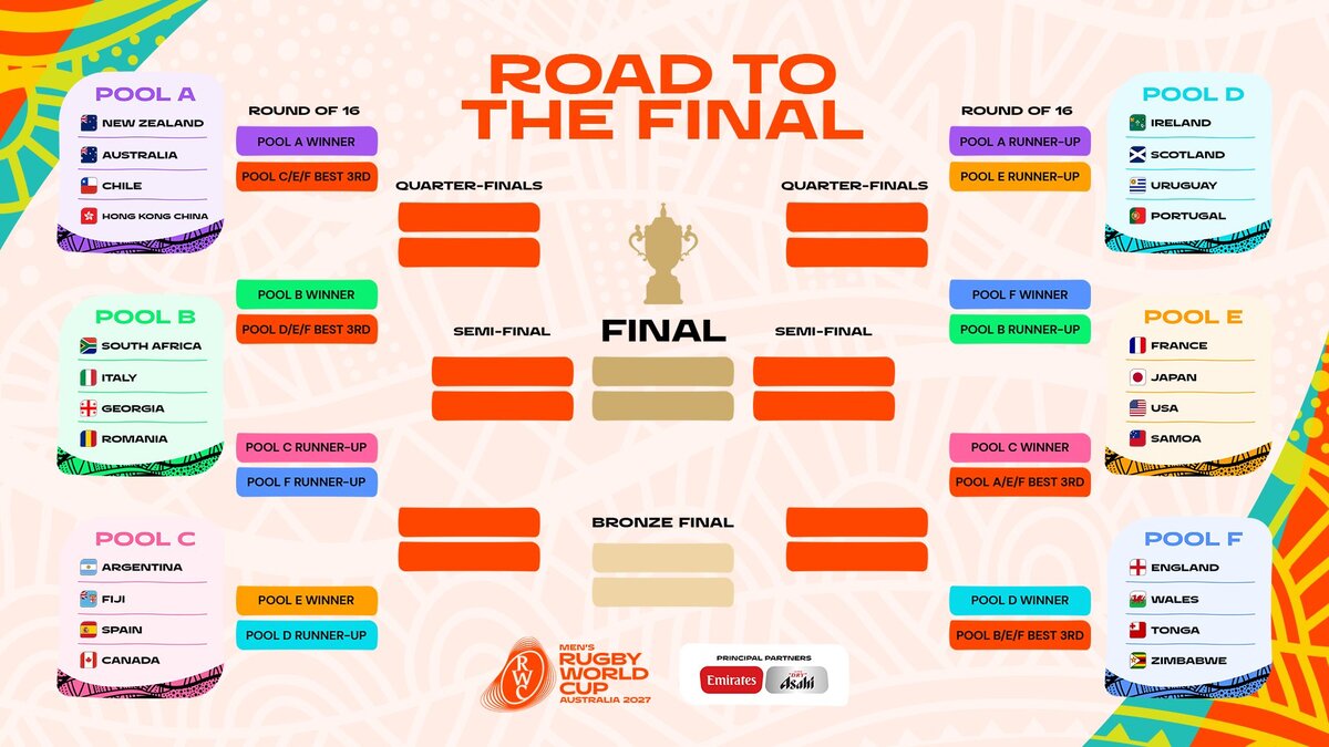 El torneo, que por vez primera contará con 24 equipos, se celebrará en territorio australiano entre el 1 de octubre y el 13 de noviembre de 2027. Salvo sorpresa, la vigente campeona Sudáfrica y los All Blacks se verán las caras en cuartos.