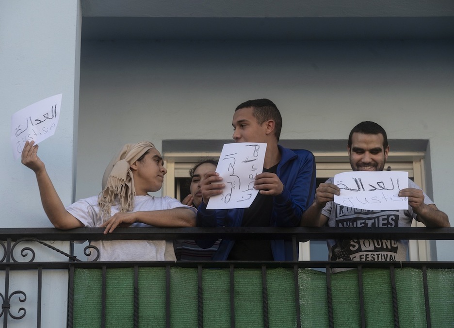 Uno de los momenos emotivos que ha dejado la marcha, cuando una familia de origen árabe ha salido al balcón con pancartas pidiendo justicia para los jóvenes de Altsasu.(Jon URBE/FOKU)