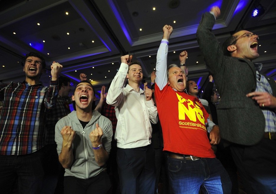 La cara opuesta en el unionismo, donde varios ciudadanos celebran la victoria del ‘No’. (Andy BUCHANAN/AFP)