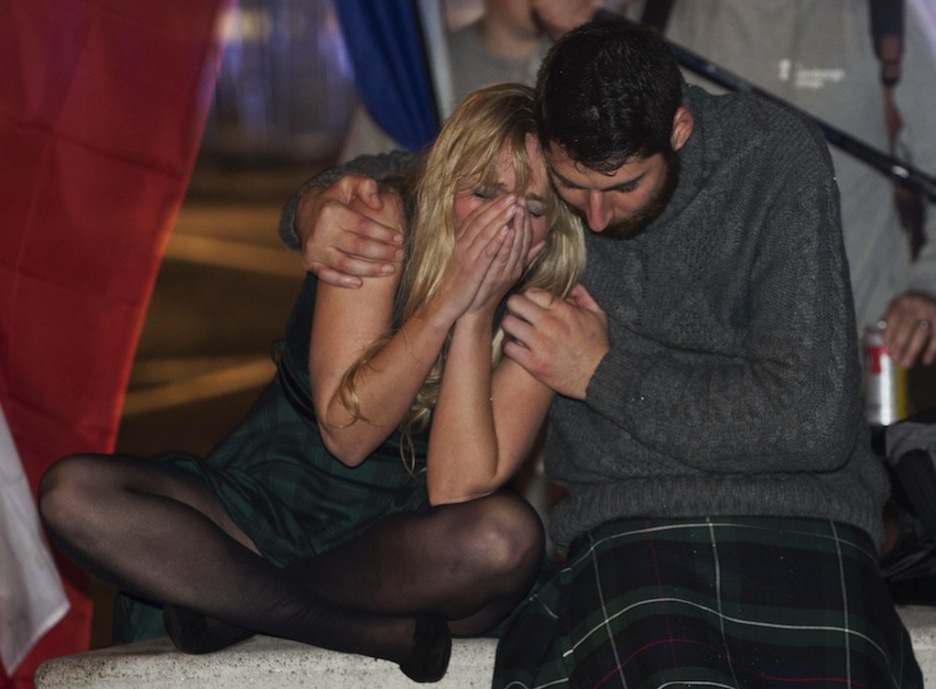 Una pareja llora tras conocerse que Escocia no ha optado por la independencia. (Lesley MARTIN/AFP)