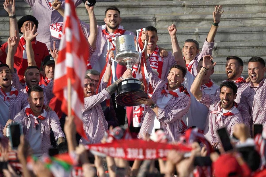 Les joueurs de l'Athletic brandissent la coupe sur les marches de l'hôtel de ville de Bilbo. (Ander GILLENEA | FOKU)