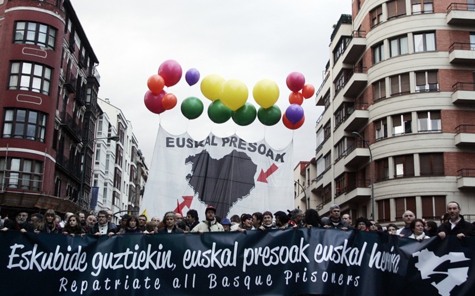 Presoen senideek Euskal Herriratzearen aldeko banderolak eraman dituzte. (Marisol RAMIREZ/ARGAZKI PRESS)