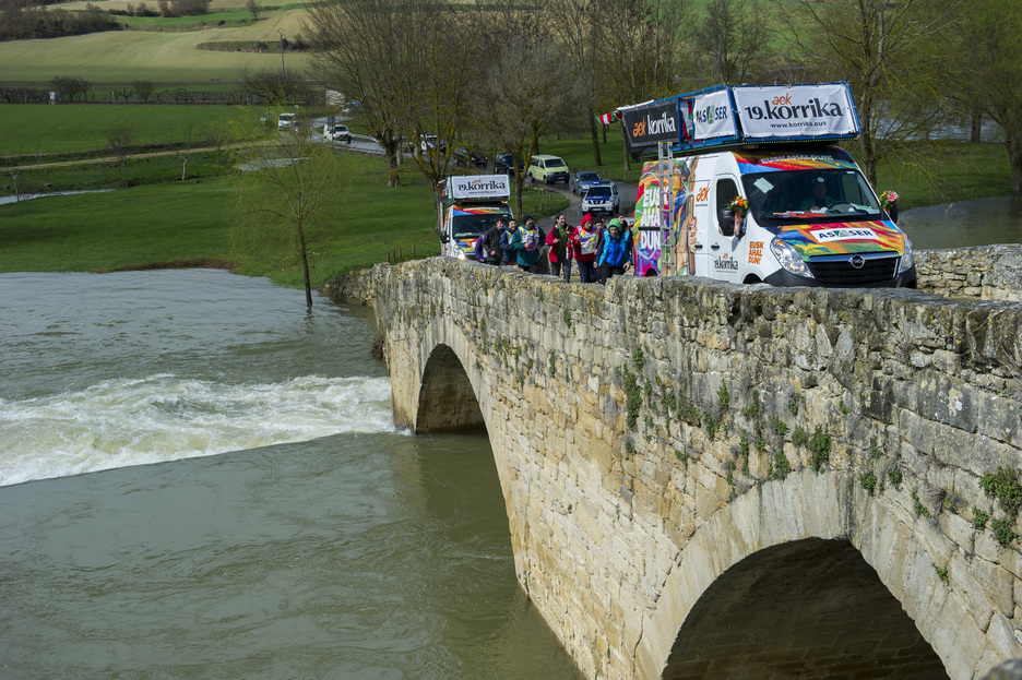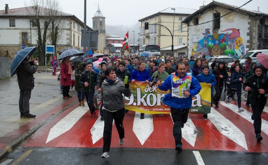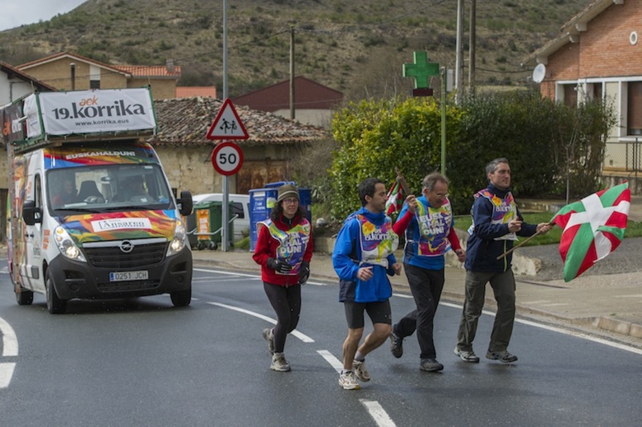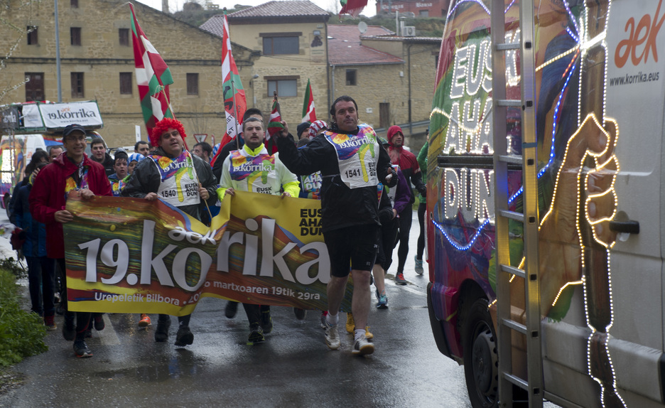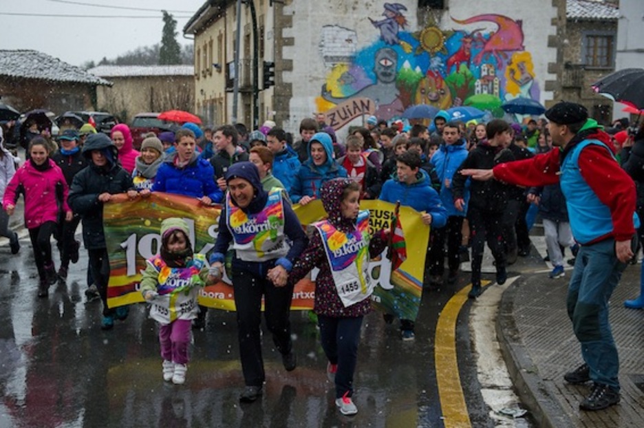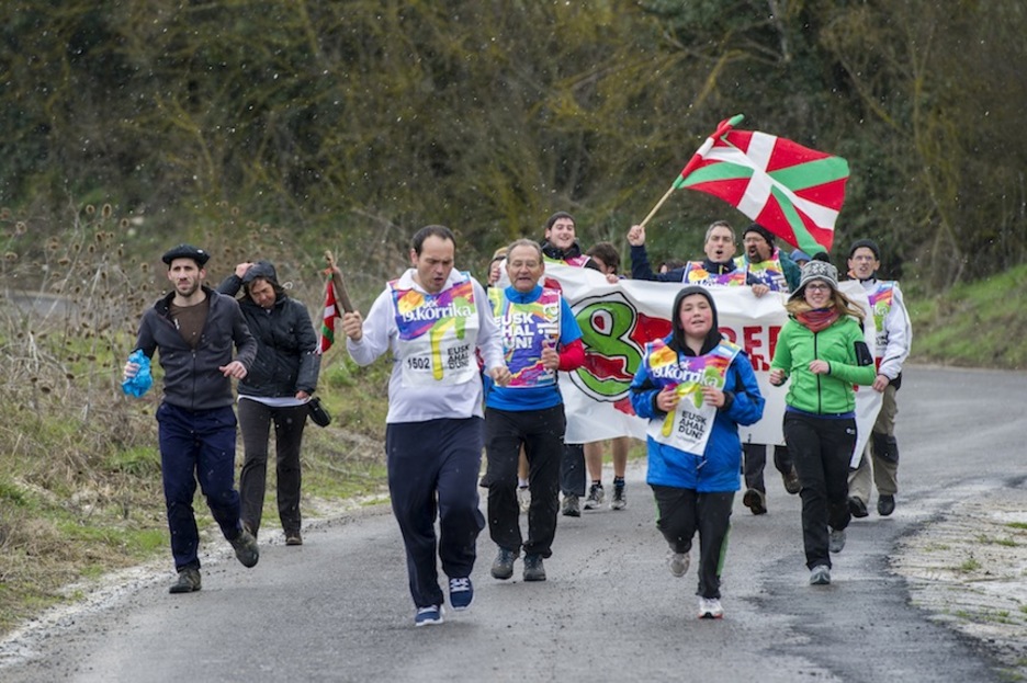 Araban barrena dabil Korrika asteazken honetan. Zenbait puntutan, elurra bidelagun izan dute lasterkariek, baina horrek ez die irribarrea aurpegitik ezabatu.