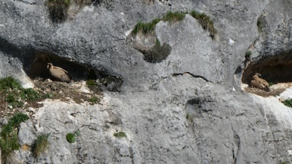 Buitres leonados, en las soleadas repisas donde crían estas aves. (Iñaki VIGOR)