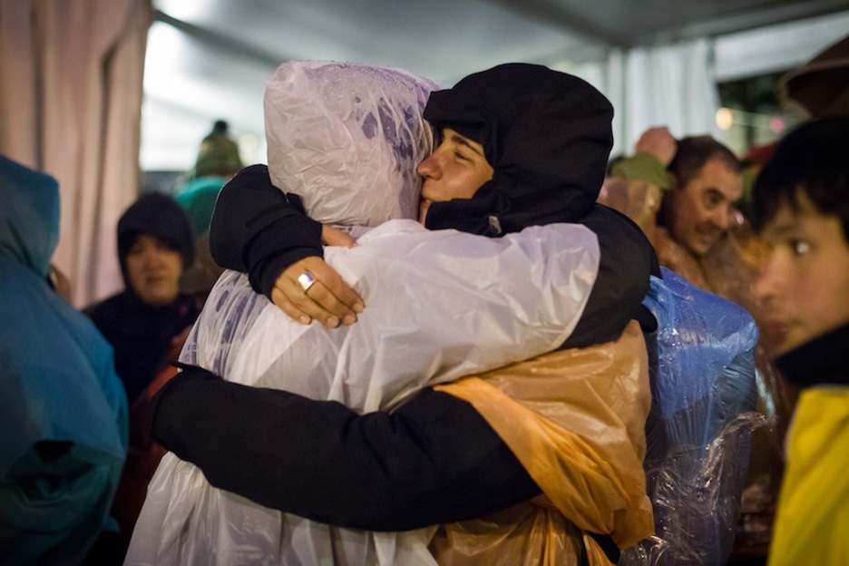 Hiru emakume Aske Gunearen karpan, ertzainak zelatan dituztela. (Aritz LOIOLA)