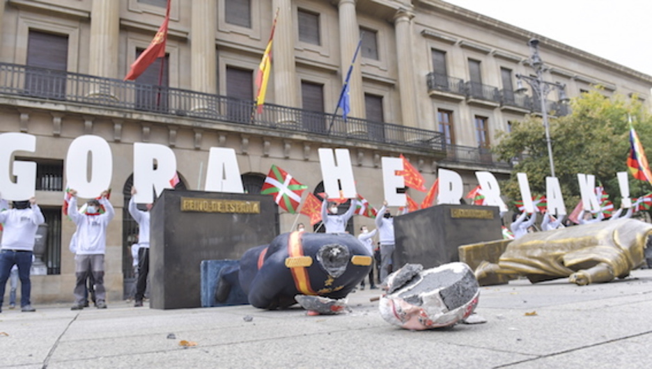 Sortuk ekimen bat egin du Iruñeko erdigunean espainiar Estatuaren nagusikeria salatzeko. Salaketa hori irudikatzeko, bi estatua bota dituzte, bata Colonena eta bestea Felipe Borboikoa.