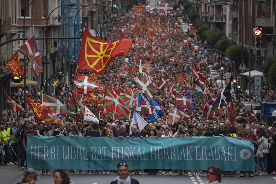 Milaka lagun bildu dira larunbat honetan Bilbon Euskal Herria herri libre bat dela ozen aldarrikatzeko eta erabakitzeko eskubidea exijitzeko. Alderdi eta sindikatu ezberdinetako kideek bat egin dute Gure Eskuren mobilizazioan.