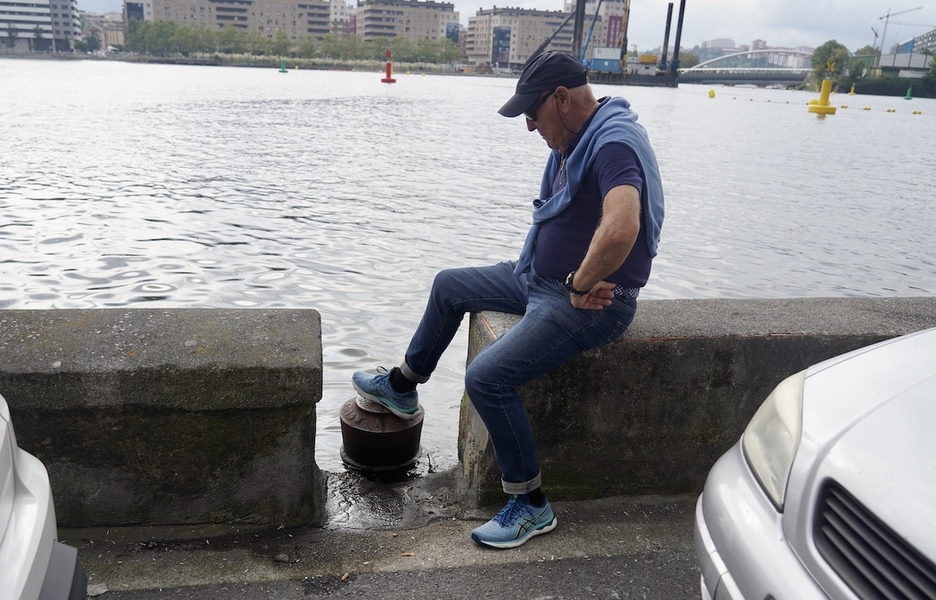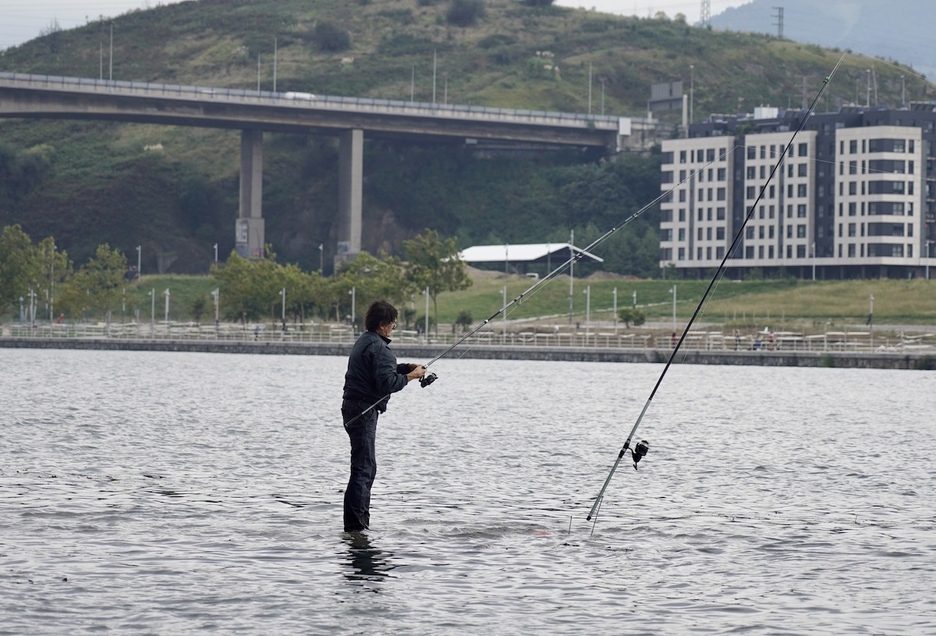 Arrantzale bat, ura orkatiletatik duela, itsasadarrean, Erandio parean. (Monika DEL VALLE | FOKU)
