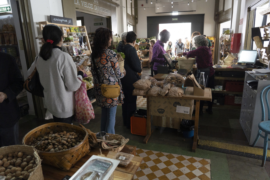 Los vecinos acuden a los comercios de Geltoki, en Iruñea, en busca de algo para comer frío y otros enseres. (Iñigo URIZ | FOKU)