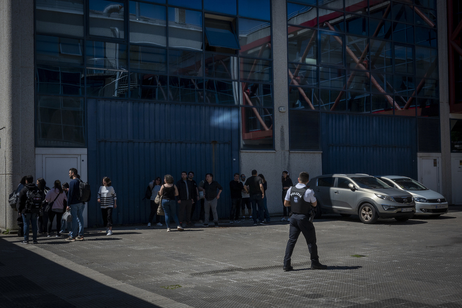 Trabajadores del polígono de Zuatzu, en Donostia, en el exterior de la planta donde la maquinaria ha estado parada. (Gorka RUBIO | FOKU)