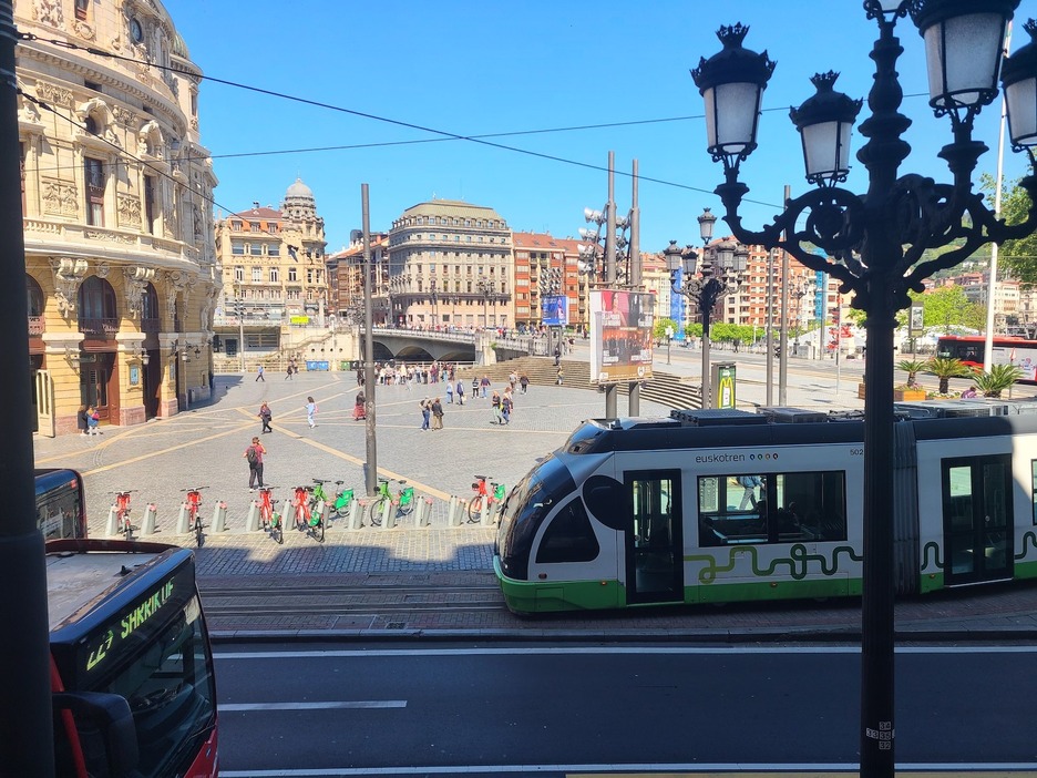 Un tranvía parado en la vía en la Plaza Arriaga. (Asier ROBLES)