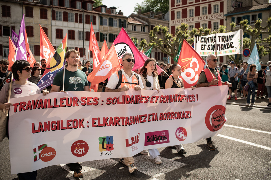 Banderolen eta eguzki betaurrekoen arteko lehia estua jokatu da maiatzaren lehenaren karietara. Bisitari anitz trenez heltzen direnez Baionara geltokiaren kanpoaldean maleta gurpildunek manifestariekin egin dute topo. Kontraste irudi bat aniztasunez beteriko martxaren atarikoan.