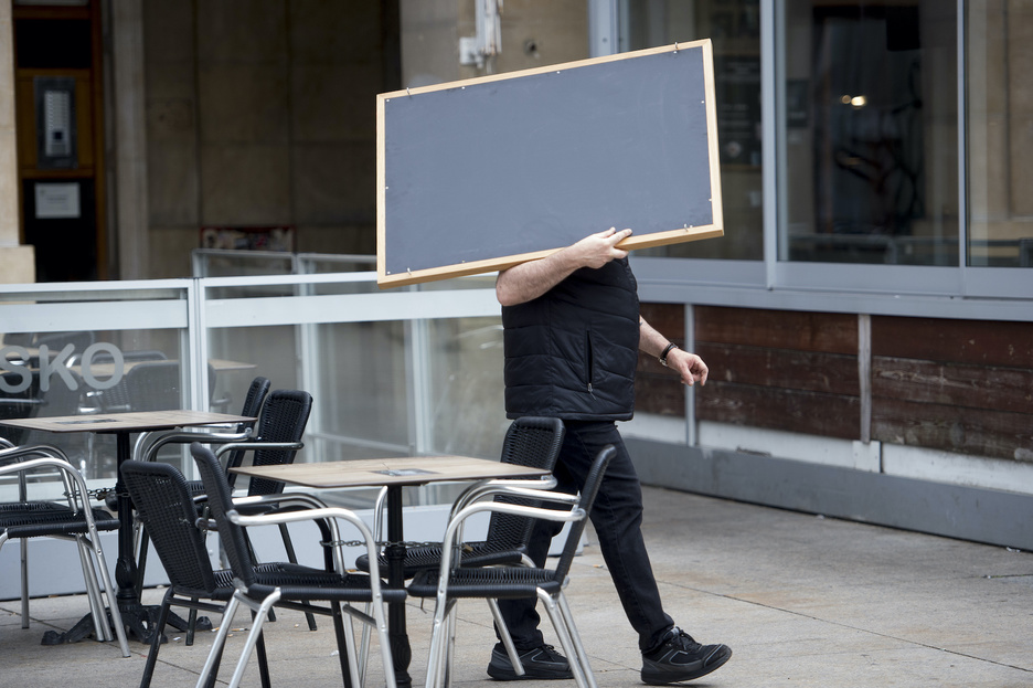 Zerbitzari bat Iruñeko bere tabernako terraza jasotzen ari da ixteko aginduaren aurrean. (Iñigo URIZ/FOKU)