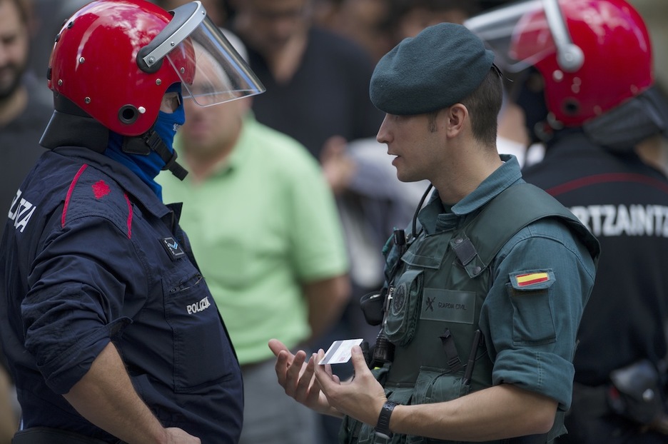 Un ertzaina y un guardia civil conversan en Hernani. (Juan Carlos RUIZ/ARGAZKI PRESS)