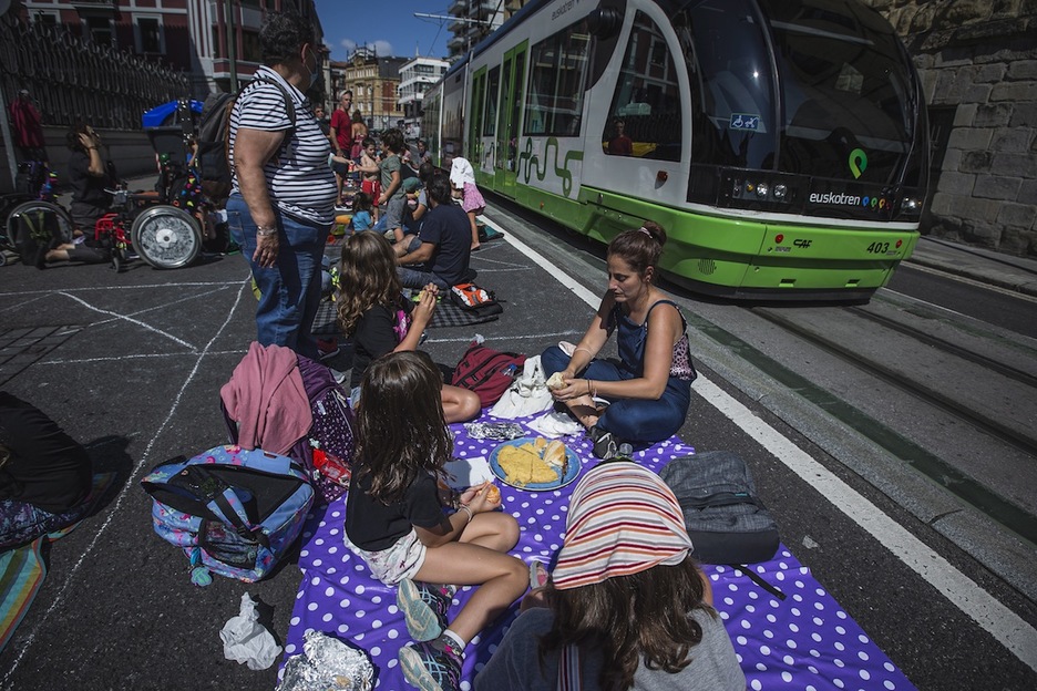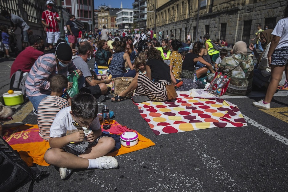 Alumnado, padres, madres y trabajadoras del comedor han realizado hoy un picnic reivindicativo para que Ayuntamiento de Bilbo y Departamento de Educación den una solución al cierre del servicio de comedor en la escuela de Atxuri.