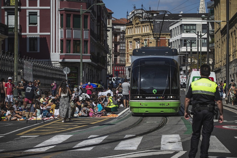 Un tranvia circula junto a la protesta. (Aritz LOIOLA/FOKU)
