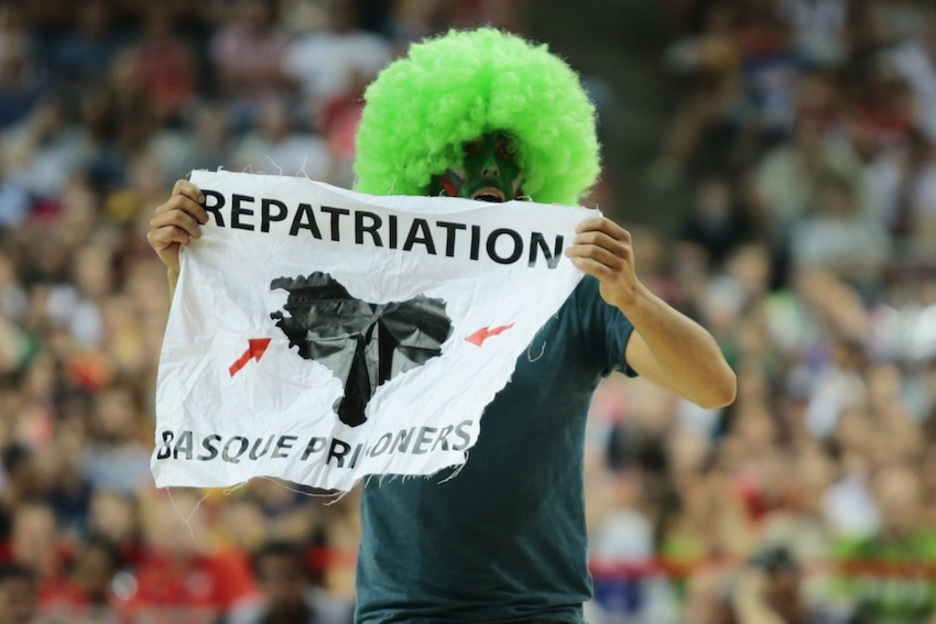 Preso eta iheslarien etxeratzearen aldarrikapena Saskibaloiko Munduko Txapelketara eraman dute. (NAIZ)