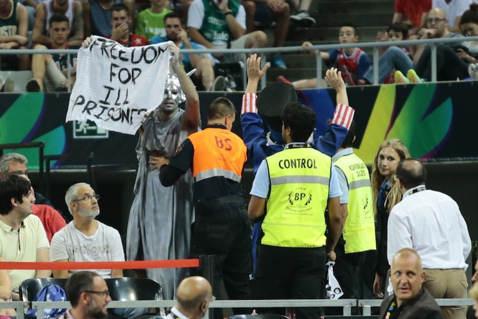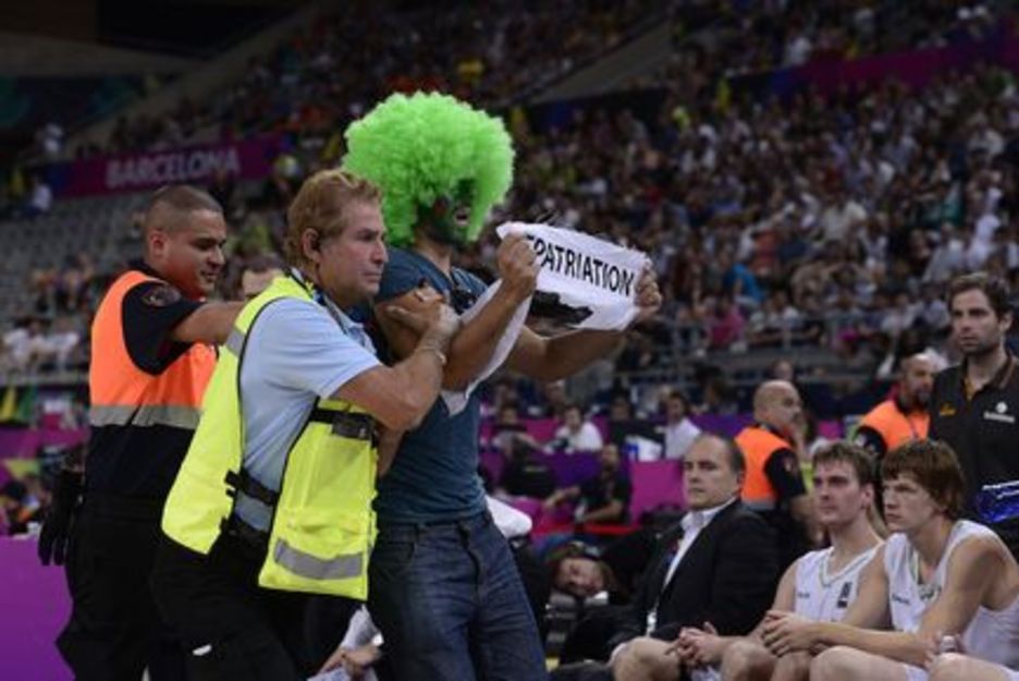 Saskibaloiko Munduko Txapelketan, Eslovenia eta ABen arteko final laurdenetako partidan, euska preso eta iheslarien etxeratzea aldarrikatu dute Bartzelonan. Ondoko irudiak jaso ditugu.