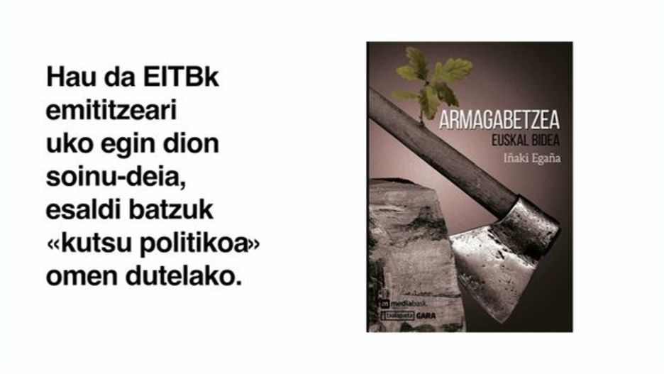 EiTBk Radio Euskadin eta Euskadi Irratian ‘Armagabetzea. Euskal bidea’ liburuari buruzko iragarki laburra emititzeari uko egin dio, esaldi batzuek «kutsu politikoa» omen dutelako. Hemen entzuten dena da kendu nahi zuten esaldia.