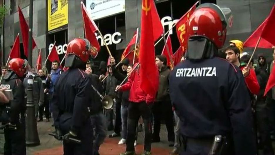 Imágenes del centro de Bilbo anteriores a la manifestación del mediodía. Ha habido diversas protestas y se han vivido algunos momentos de tensión entre los piquetes y la Ertzaintza en las inmediaciones de El Corte Inglés.