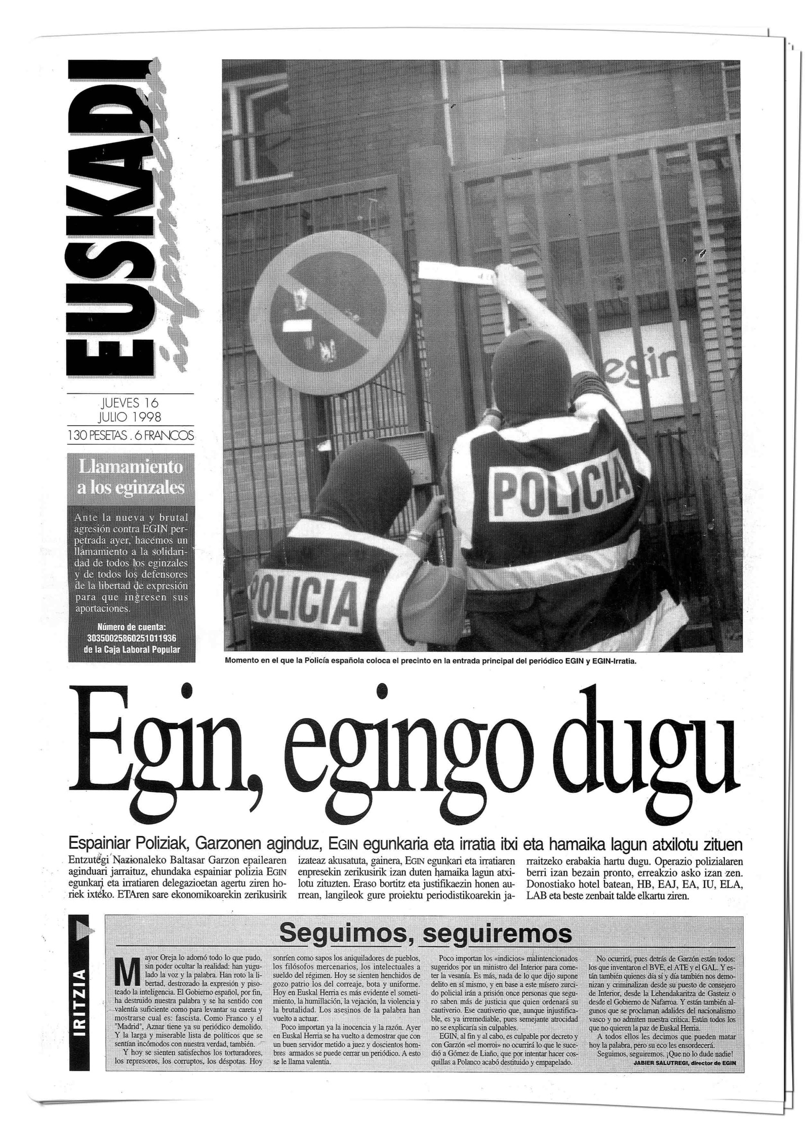 Así, como la ignorancia es atrevida, y máxime cuando el objetivo es hacer daño a cualquier precio, el 15 de julio de 1998 la Policía española asaltó las instalaciones del diario 'Egin' y Egin Irratia en un operativo político-judicial que en 2009 el Tribunal Supremo declaró «ilícito» y dejó sin efecto el decomiso y liquidación de su patrimonio.