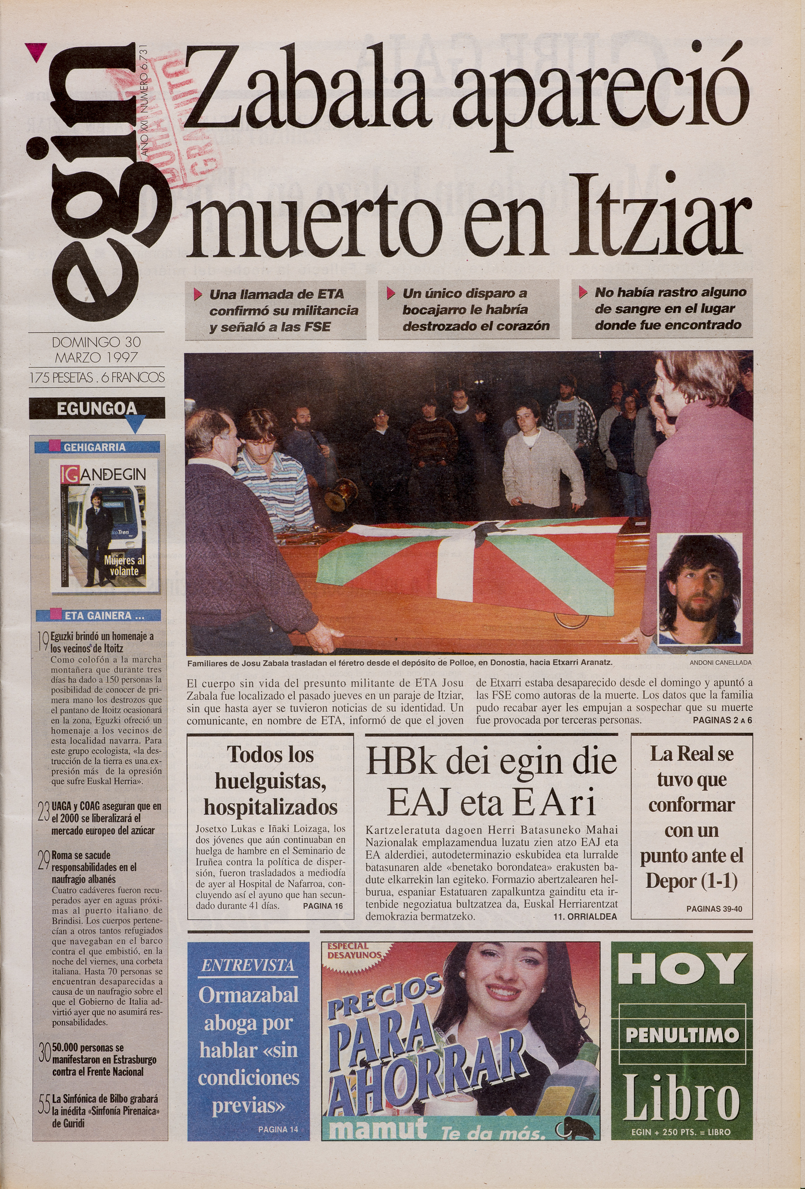 El de Josu Zabala 'Basajaun' es uno de los casos de militantes de ETA fallecidos sin esclarecer que más opaco permanece, 27 años después. Su cadáver fue hallado por unos montañeros en el paraje de Itsaspe, en Itziar, el jueves 27 de marzo de 1997, pero públicamente no trascendió quién era hasta el día 29, cuando Egin Irratia dio cuenta de ello. Tenía un impacto de bala con orificio de entrada a la altura del pecho y salida por la espalda.