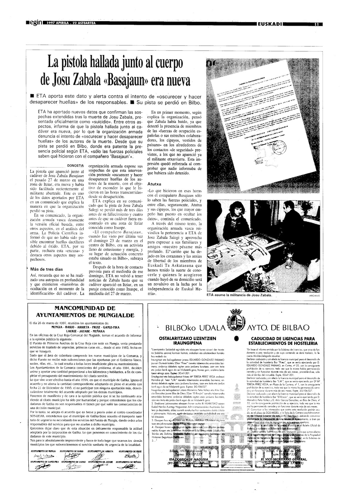 El sábado por la mañana, una segunda llamada a la misma emisora en nombre de ETA reiteró la militancia de 'Basajaun' y dio más datos: que estaba en paradero desconocido desde el domingo anterior, 23 de marzo, día en que había quedado en Bilbo con otro militante, pero no apareció a la cita. El comunicante expresó su convencimiento de que había sido secuestrado por «las fuerzas represivas» para finalmente ser ejecutado.