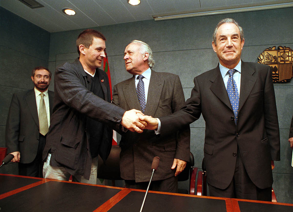 Xabier Arzalluz y Joseba Egibar, en nombre del PNV; Carlos Garaikoetxea y Rafa Larreina, por parte de EA; Arnaldo Otegi y Joseba Permach por EH; y el lehendakari Juan José Ibarretxe suscribieron el 18 de mayo de 1999 en la sede de la Presidencia de Lakua el llamado oficialmente Acuerdo de Bases de Colaboración para la legislatura 1999-2002. Decenas de periodistas, fotógrafos y cámaras de televisión asistieron al evento, dejando pequeña la sala.