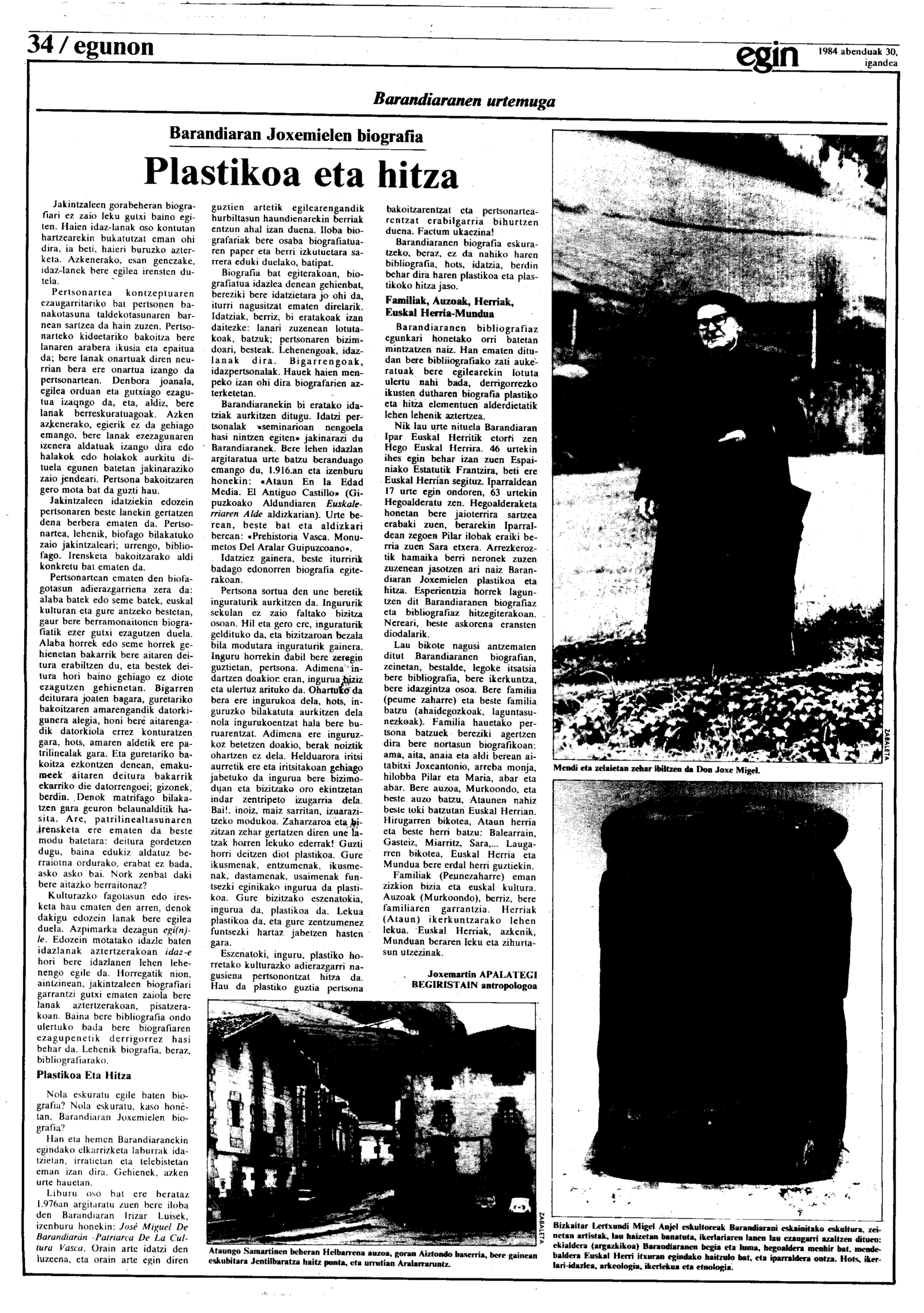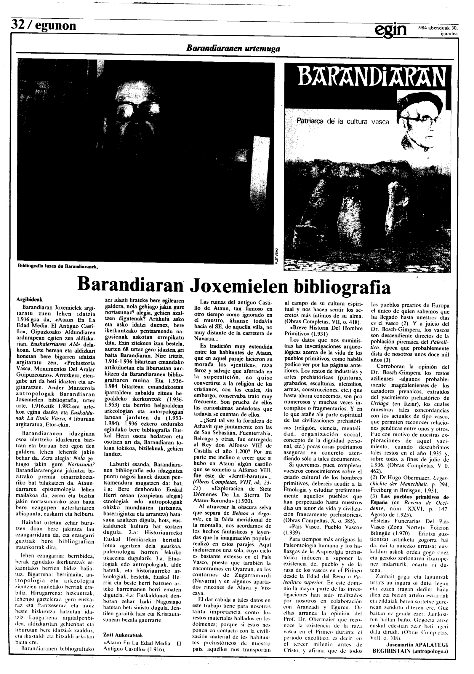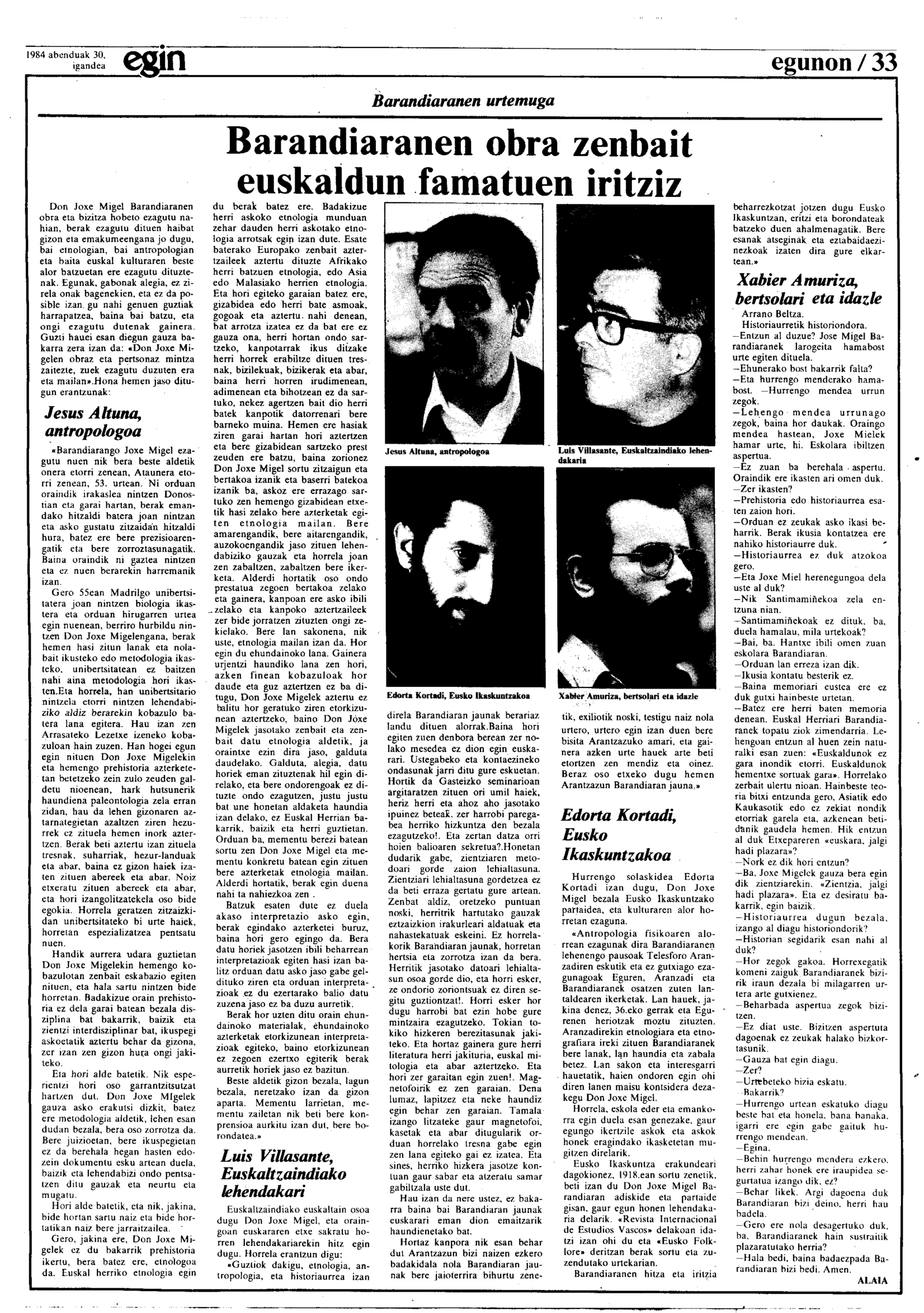 1984ko abenduaren 30ean, Joxe Migel Barandiaran antropologo eta etnografoaren urtebetetze egunaren bezperan, 'Egin'-ek erreportaje berezi bat argitaratu zuen Ataungo jakintsuaren inguruan. Martin Garitano kazetariak berarekin emandako egunaren kronika egin zuen, eta horrez gainera, erreportajeak zenbait «euskaldun famaturen» iritzia eta Barandiaranen herrikide Joxe Martin Apalategi Begiristain antropologoak idatzitako bibliografia eta biografia bildu zituen.