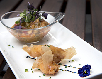 Crujiente de langostino especiado y bacalao ajoarriero