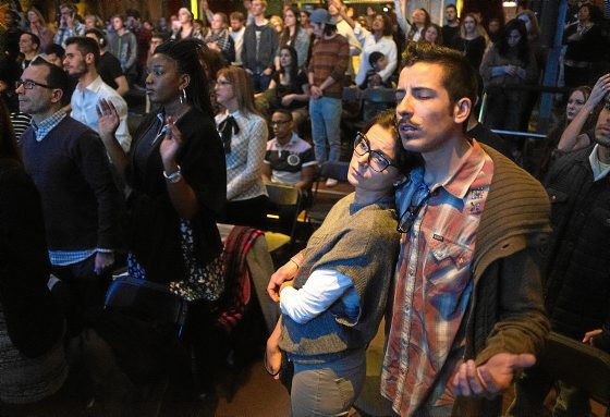 Hay catalanes, españoles, latinoamericanos y algún turista de paso que se ha dejado caer. Juan comienza a leer la Biblia a través de su Mac Book Pro. Detrás de él, en una pantalla gigante, se proyectan frases bíblicas y letras de las canciones en inglés y castellano para el karaoke. Si no fuera por las letras, con reiteradas alegorías a Jesús y al Espíritu Santo, podríamos decir que estamos en una discoteca de horario infantil. La emoción está a flor de piel y a alguno de los presentes incluso se le saltan las lágrimas. «Ahora sé quién soy en ti mi Dios», canta la banda a ritmo de música disco y todo el mundo la tararea como si se tratara del último hit de Shakira. «Lo estoy flipando», comentan unas chicas.
