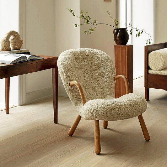 La silla Clam, o “Muslingstol” en danés, fue diseñada en 1944 por Arnold Madsen, un tapicero que no estaba entrenado en diseño y, por lo tanto, diseñó el modelo original para su asiento de yeso con forma orgánica. Se asoció con el experto ebanista Henry Schubell en 1945 y se dieron cuenta de la pieza bajo su nuevo apodo de Madsen & Schubell, poniéndola en producción con la empresa noruega Vik & Blindheim.