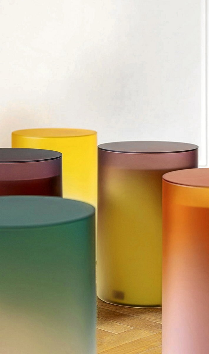 Los diseñadores checos Kristýna Mikolášková y Tereza Drobná han desarrollado una colección de coloridas mesas auxiliares de vidrio que se pueden combinar con modelos metálicos más pequeños para alterar su apariencia. Las mesas de dulces fueron diseñadas por Mikolášková&Drobná como piezas de anidación que pueden funcionar individualmente o apilarse juntas. Producidas en una gama de seis tonos sólidos, las mesas cilíndricas de metal asumen una estética diferente cuando se superponen con uno de los elementos de vidrio más altos. Las mesas se venden individualmente en colores que incluyen naranja, lila, rosa, amarillo, azul y verde menta. Ofreciendo lo que Mikolášková y Drobná describieron como «una nueva versión de las mesas laterales decorativas», la colección permite a los usuarios personalizar el aspecto de un espacio combinando colores para producir diferentes efectos. Las mesas de vidrio cuentan con un efecto degradado que se introduce durante el proceso de producción utilizando una técnica de pulverización. Luego se agrega una capa de blanco mate para crear el efecto translúcido hacia la parte inferior. Las mesas son fabricadas utilizando métodos tradicionales por artesanos del vidrio de las regiones de Nový Bor y Železný Brod. «Para minimizar el desperdicio de material, las mesas de vidrio se crean cortando un cilindro de vidrio de varios metros de largo», explicaron los diseñadores. «La parte superior se une luego como una 'tapa' y, finalmente, todo se pule manualmente para garantizar que las mesas estén formalmente impecables». La colección incluye dos tamaños: una versión baja donde la mesa de cristal tiene un diámetro de 450 milímetros y un tamaño más alto con un diámetro de 300 milímetros.