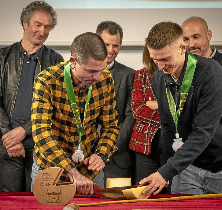 Julen Baz y Peli Perez de Anuzita, del restaurante Garena de Dima, cortando el queso. (Aitor Karasatorre | FOKU)